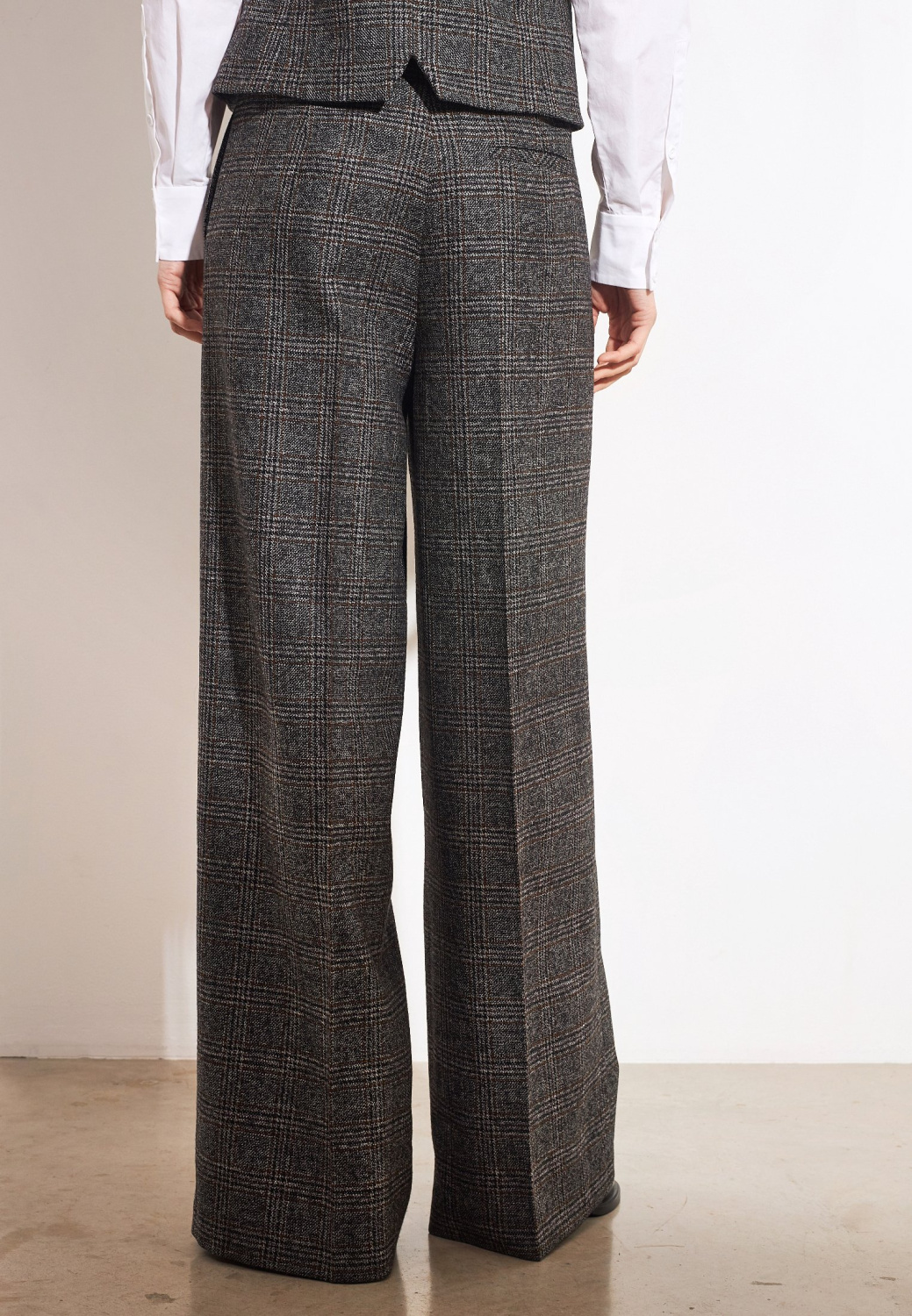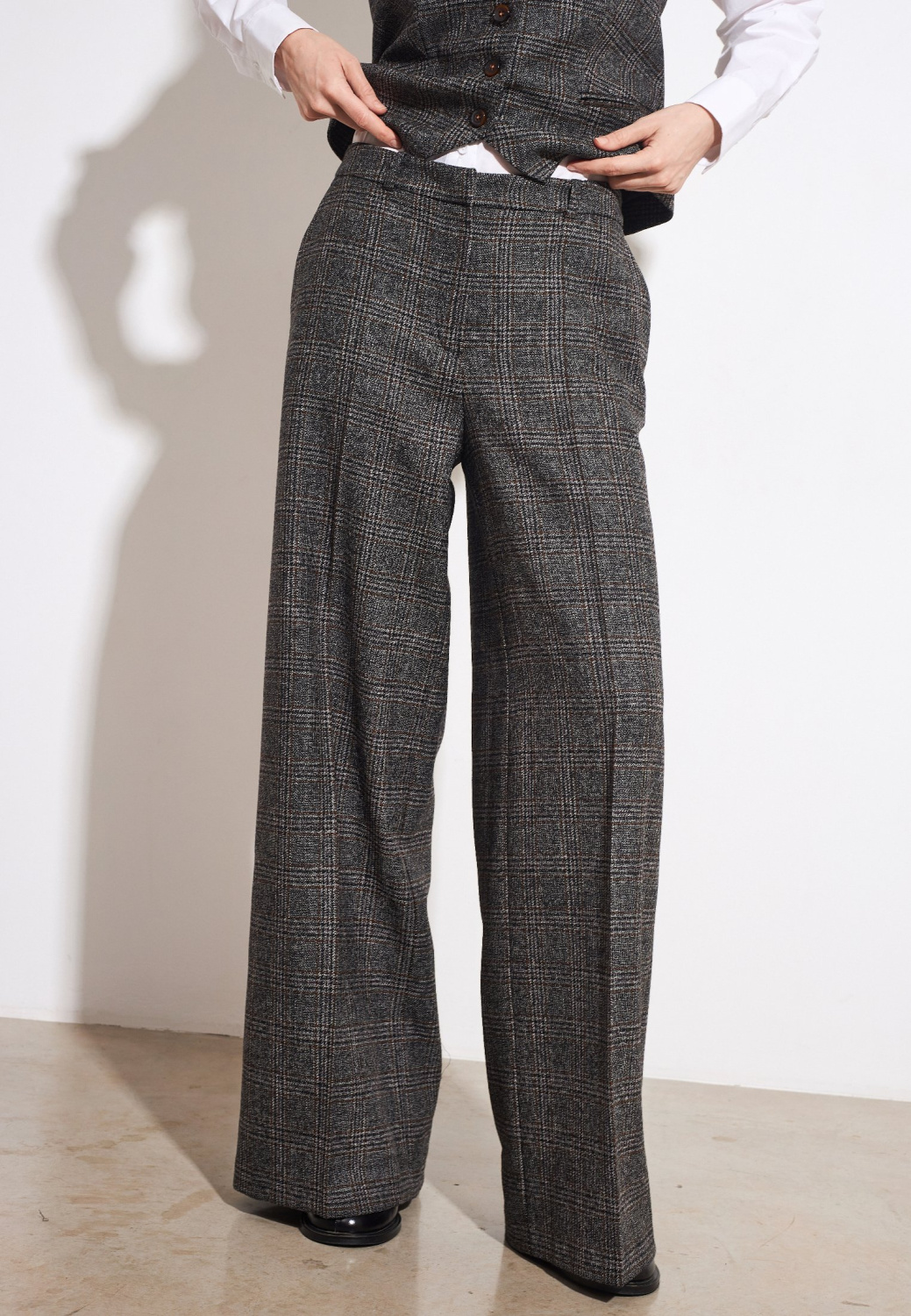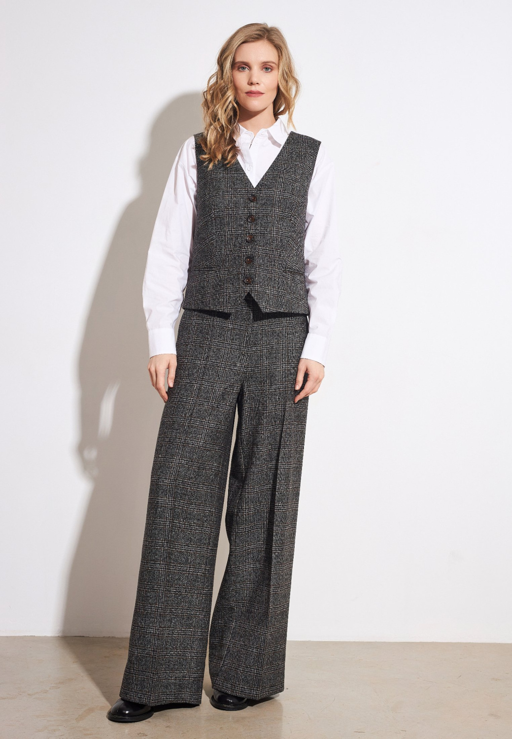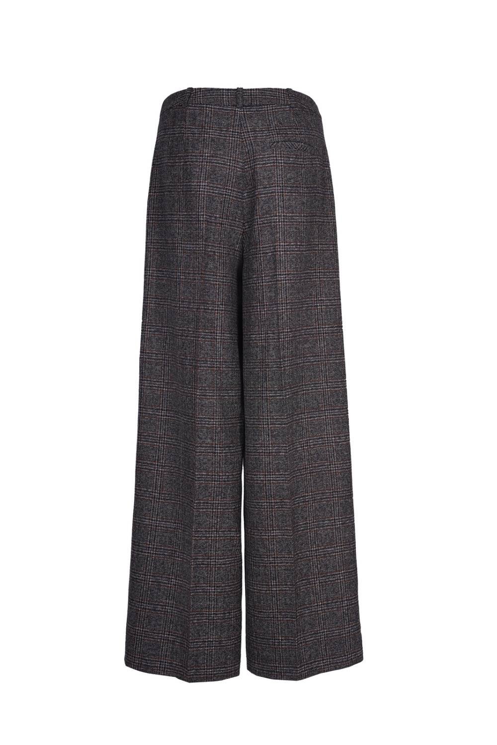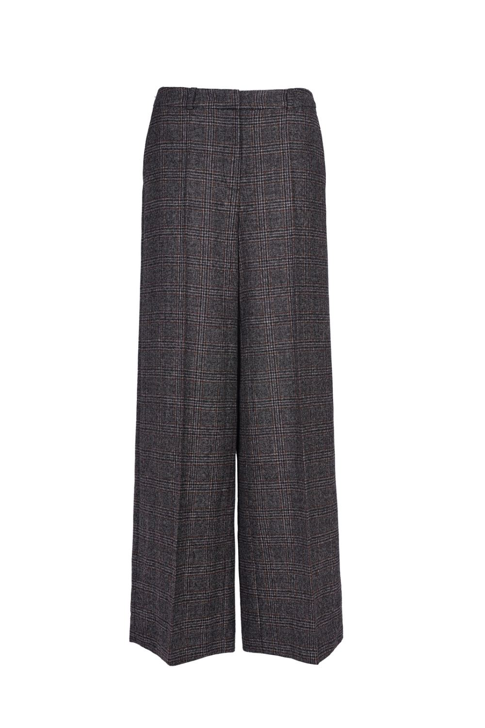 Широкие брюки в черную клетку - один из главных трендов  этого сезона. Чтобы встроить акцентные разновидности клетки в повседневные образы можно поиграть с цветом: подберите верх в тон одного из оттенков клетки на ткани брюк.