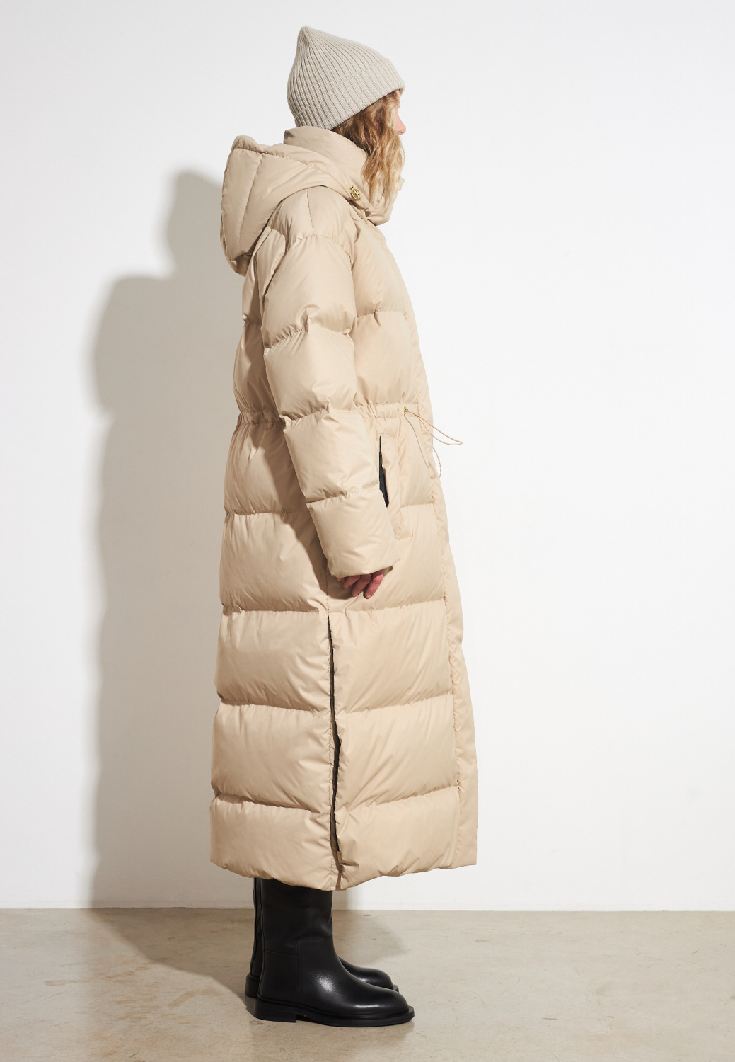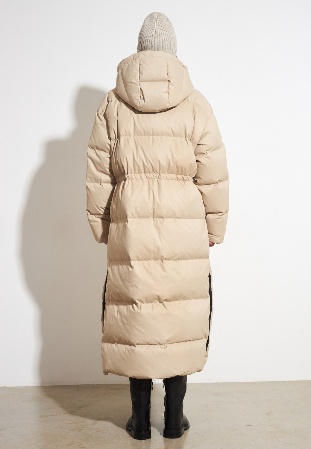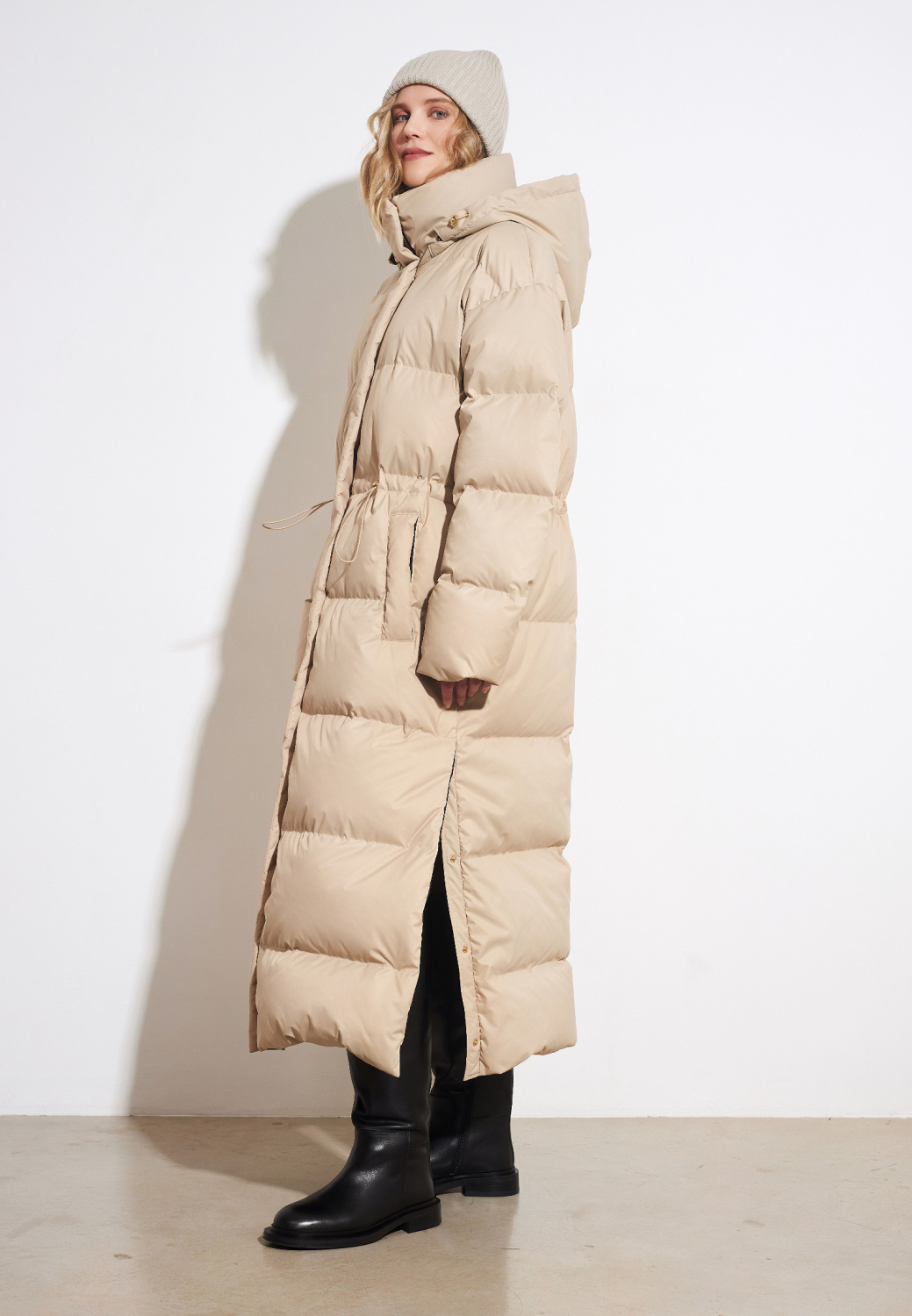 Длинный женский пуховик с горизонтальной стёжкой - базовая вещь в зимнем гардеробе. Контрастная внутренняя отделка делает изделие практичным в носке. Воротник стойка надежно закрывает шею, а кулиса на талии позволяет варьировать силуэт от прямого до более женственного. Пуховик имеет натуральный наполнитель из гусиного пуха, распределенного в специальные пакеты, защищающие наполнитель от миграции.