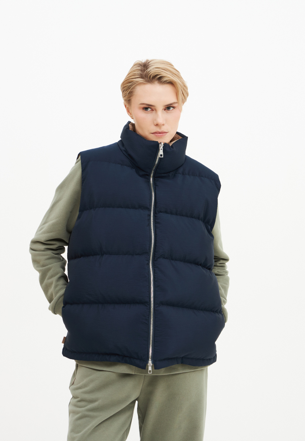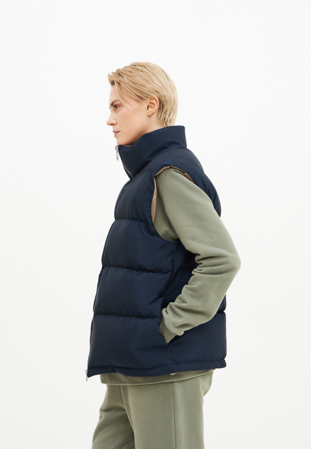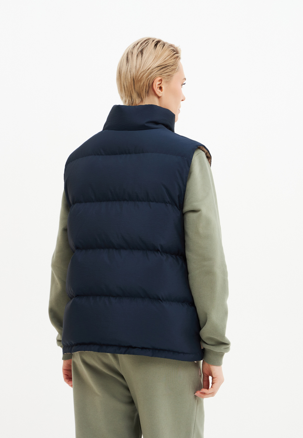 Женский двусторонний пуховой жилет на молнии, в классическом стиле, универсально подходит для прохладных и ветренных дней, изготовлен из ткани с водоотталкивающей пропиткой и креш эффектом.
