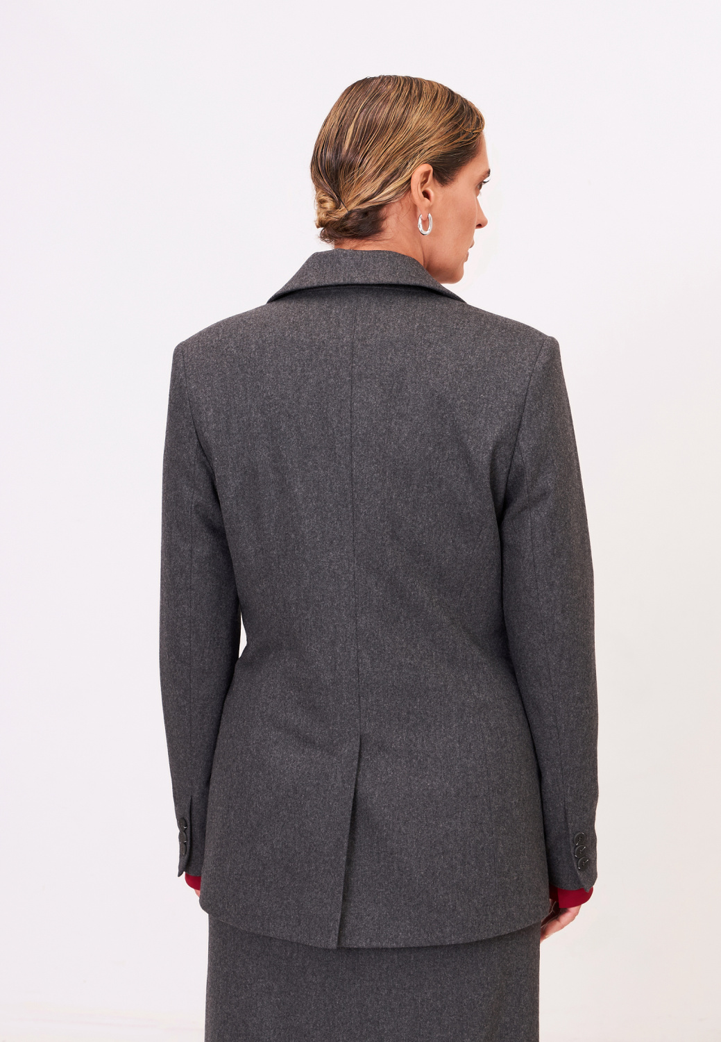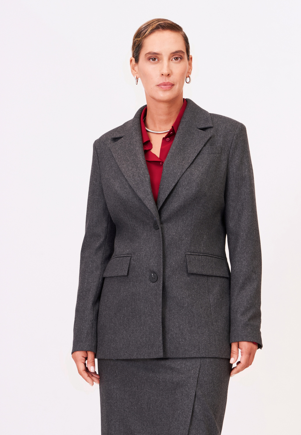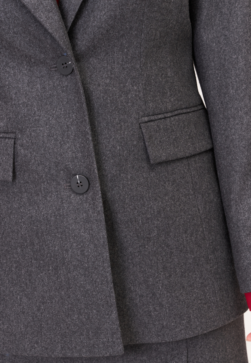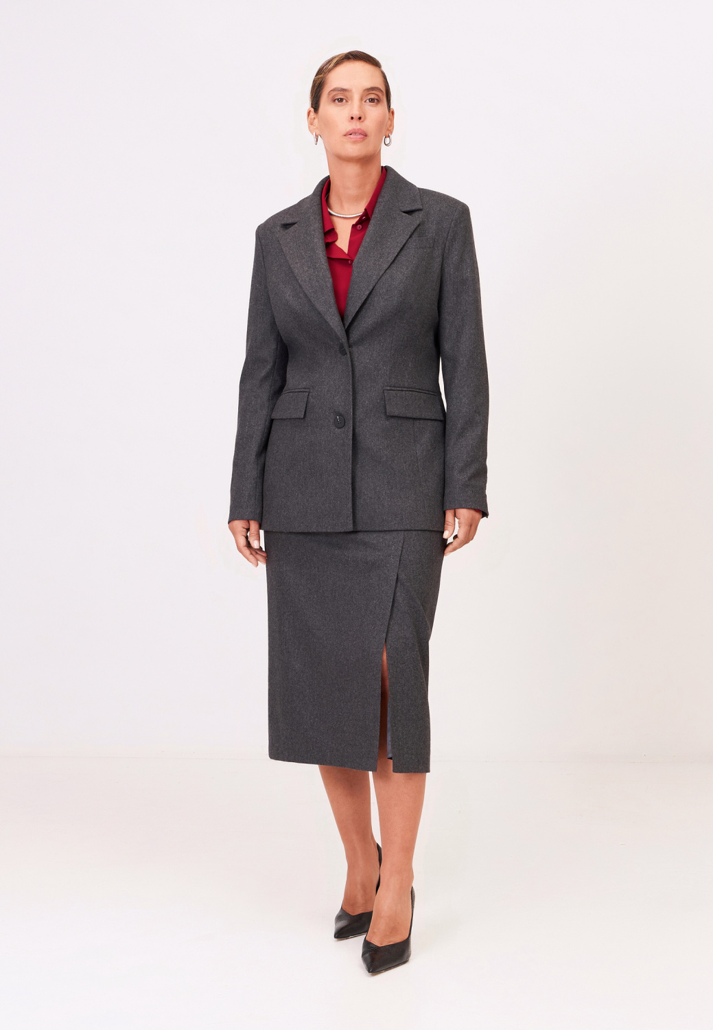 Классический жакет полуприлегающего силуэта подойдет как для формальных встреч, так и для создания повседневных образов. Незаменимая классика будет сочетаться с любым верхом: базовыми рубашками, атласными топами или трикотажными водолазками. Дополнить модель можно юбкой из комплекта.